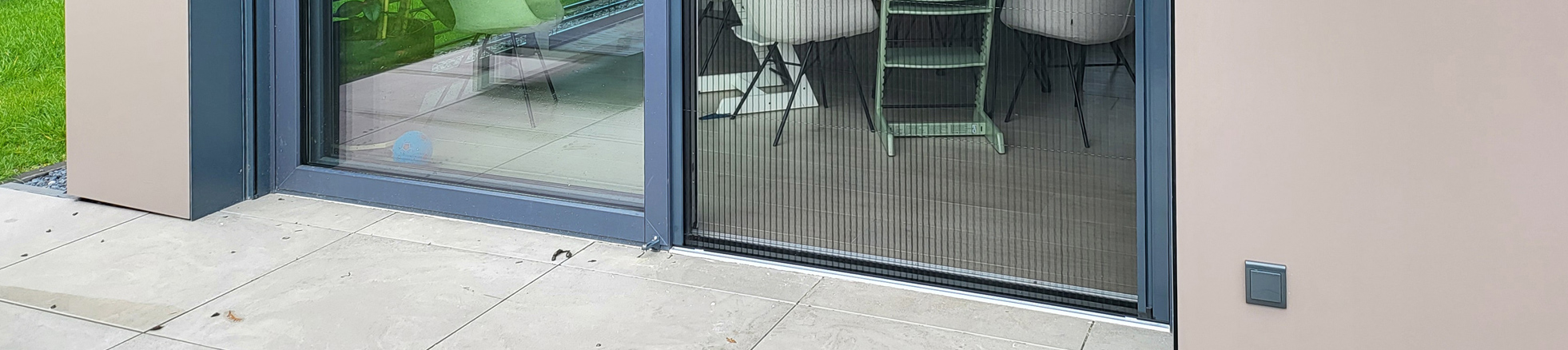 Installation de moustiquaires plissées pour une porte coulissante donnant sur une terrasse à Esch-Sur-Alzette. Les profilés de la moustiquaire sont au coloris RAL des châssis du client. La moustiquaire se déplie en accordéon pour venir s’aimanter dans notre profilé. L’étanchéité est parfaite !